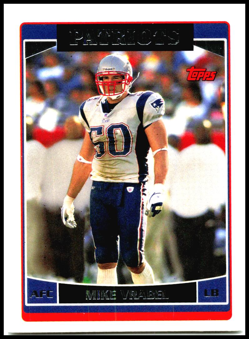 This is a nice example of a 2006 Topps #145 Mike Vrabel .Other important information about this card: SN In 2006 Mike Vrabel played for the New England Patriots. ***ANY STREAKS IN THE IMAGES ARE FROM THE SCANNER AND NOT THE CARD***๐ Card Description & ConditionWe take pride in providing an accurate and transparent representation of each card.RAW (Ungraded) Cards: Grading is subjective. While we strive to assess condition accurately, final judgment is up to the buyer.High-Resolution Scans (500+ DPI): Inspect every detail with confidence.No Stock Photos: The card pictured is the exact one youโll receive.Graded Cards: Listed with their PSA/BGS/SGC rating and certification number for verification.๐ข Please review all images carefully before purchasing. Have questions? Feel free to ask!Shipping for auctions is whatever is listed in the auction.ย Some will be $4.99 while others may be free. Many auctions will ship in plain white envelopes, bubble mailers, or rigid cardboard to utili