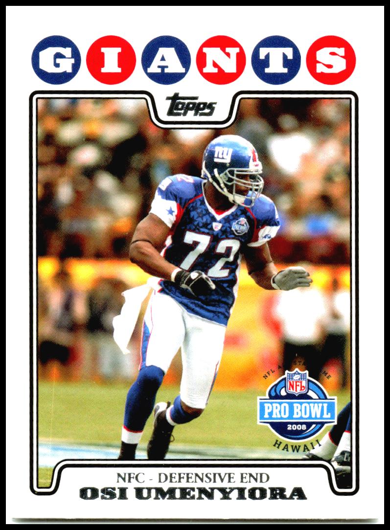 This is a nice example of a 2008 Topps #303 Osi Umenyiora .Other important information about this card: In 2008 Osi Umenyiora played for the New York Giants. ***ANY STREAKS IN THE IMAGES ARE FROM THE SCANNER AND NOT THE CARD***๐ Card Description & ConditionWe take pride in providing an accurate and transparent representation of each card.RAW (Ungraded) Cards: Grading is subjective. While we strive to assess condition accurately, final judgment is up to the buyer.High-Resolution Scans (500+ DPI): Inspect every detail with confidence.No Stock Photos: The card pictured is the exact one youโll receive.Graded Cards: Listed with their PSA/BGS/SGC rating and certification number for verification.๐ข Please review all images carefully before purchasing. Have questions? Feel free to ask!Shipping for auctions is whatever is listed in the auction.ย Some will be $4.99 while others may be free. Many auctions will ship in plain white envelopes, bubble mailers, or rigid cardboard to utilize e