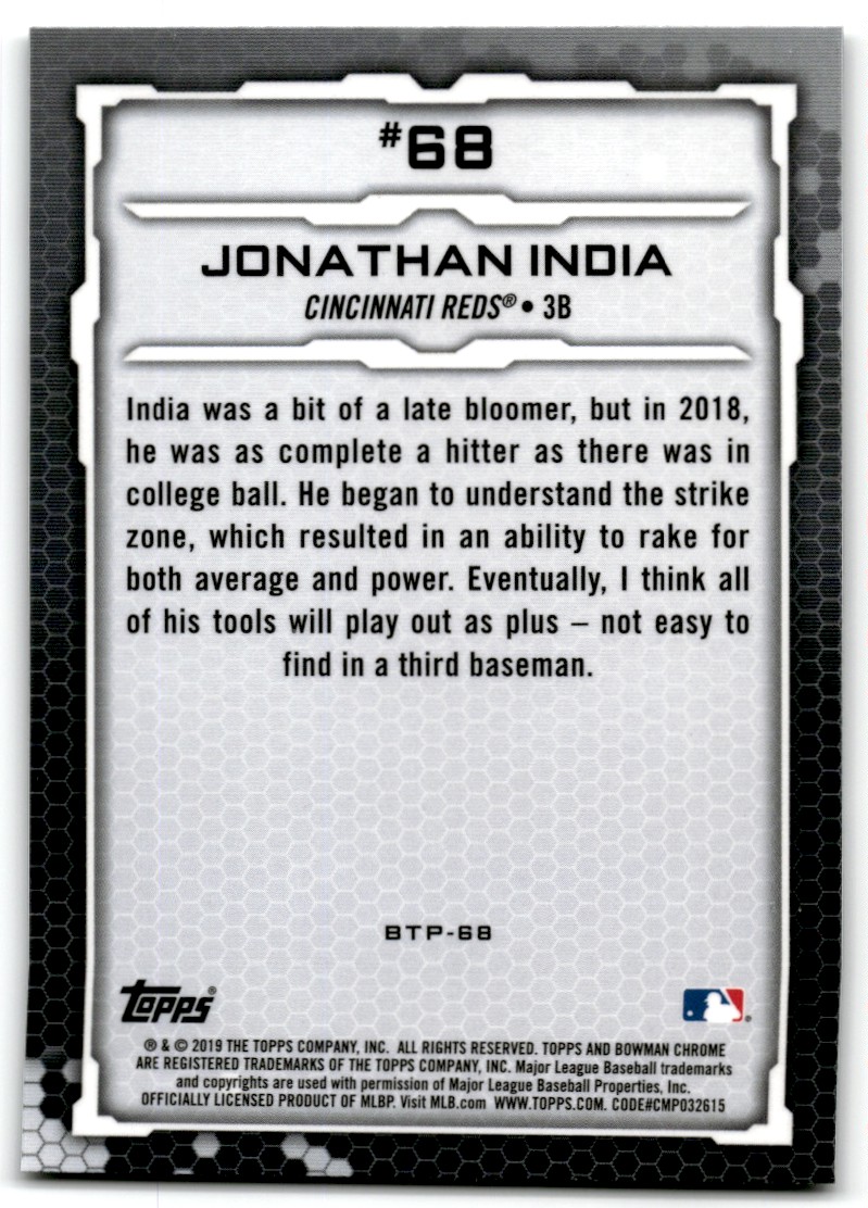 | 2018 Bowman Chrome Scouts Top 100 #BTP-68 Jonathan India | ||||||||||||||||||