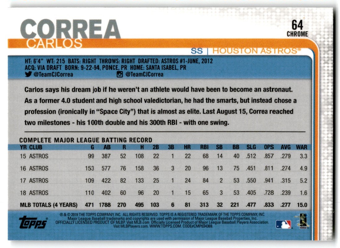 | 2019 Topps Chrome Prism Refractor 64 Carlos Correa | ||||||||||||||||