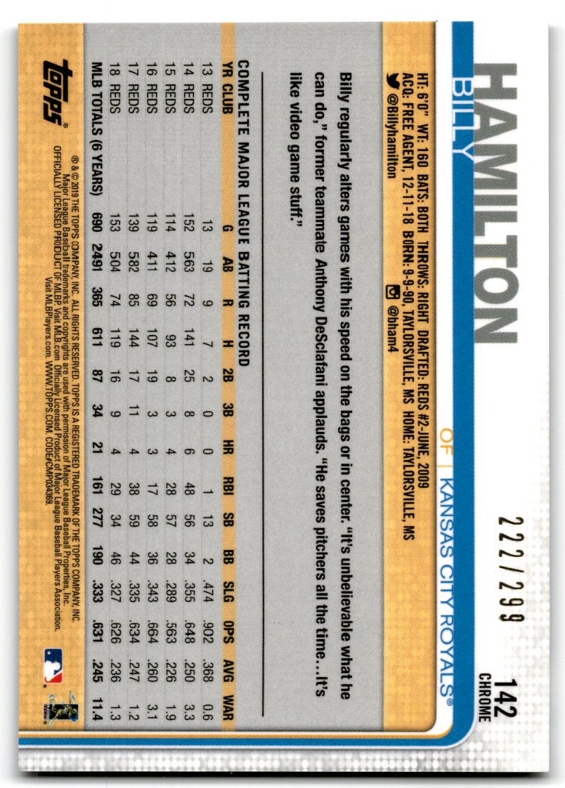 2019 Topps Chrome Purple Refractor 222/299 142 Billy Hamilton | ||||||||||||||||||