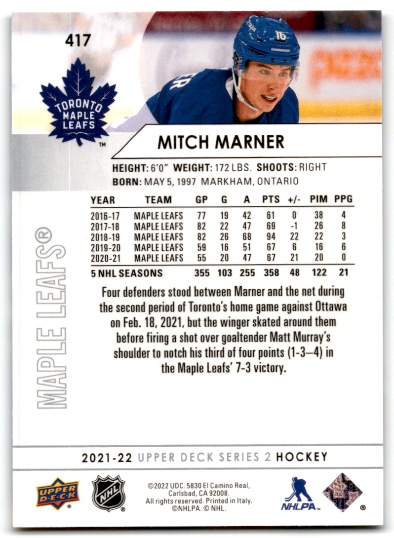 2021-22 Upper Deck 417 Mitch Marner | ||||||||||||||||
