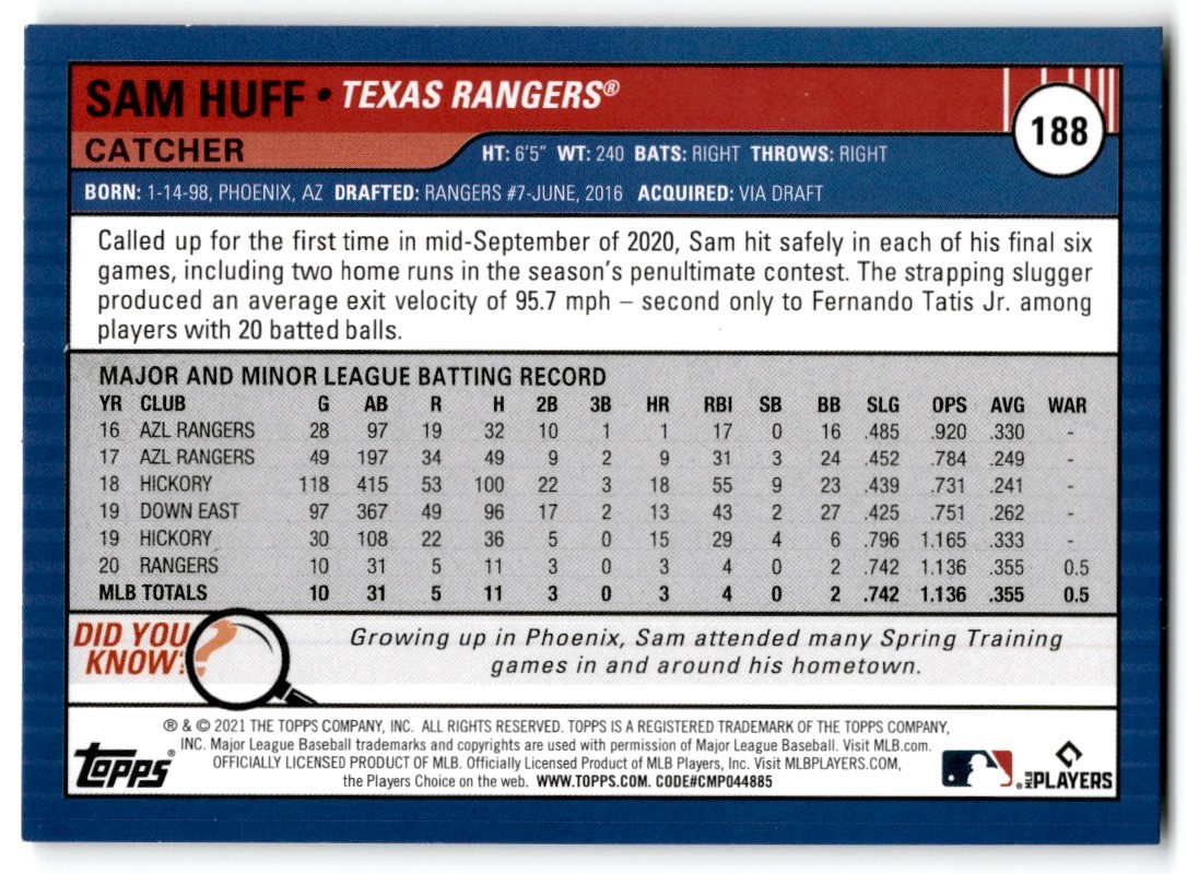 2021 Topps Big League Sam Huff Texas Rangers #188