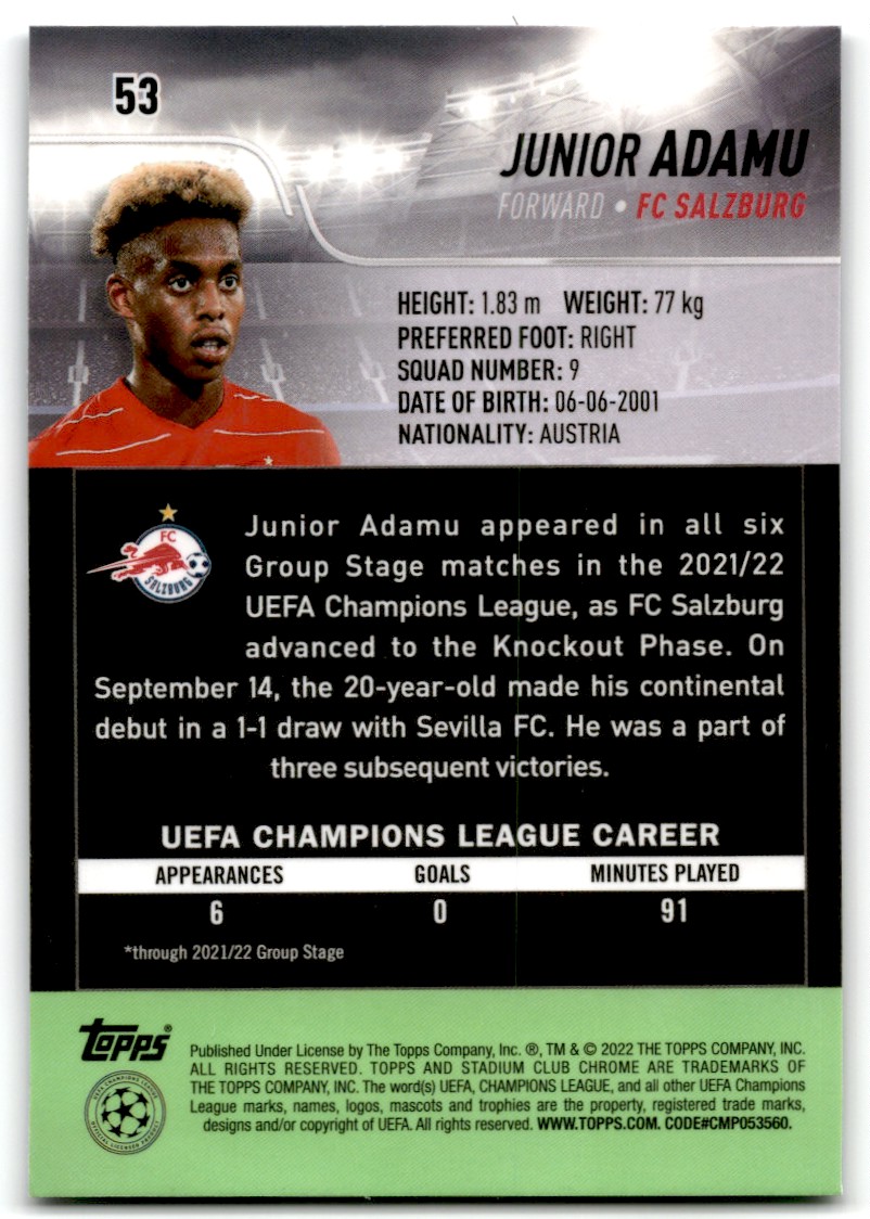 2022 Stadium Club Chrome Junior Adamu FC Salzburg #53