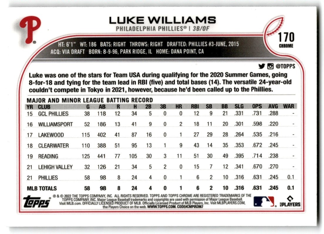 2022 Topps Chrome X-Fractor Luke Williams Rookie Philadelphia Phillies #170