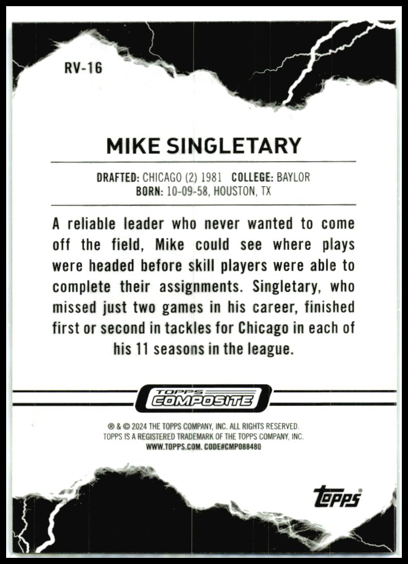 This is a nice example of a 2023 Topps Composite #RV-16 Mike Singletary Resurgence Voltaic Refractor.Other important information about this card: In 2023 Mike Singletary played for the Bears. ***ANY STREAKS IN THE IMAGES ARE FROM THE SCANNER AND NOT THE CARD***๐ Card Description & ConditionWe take pride in providing an accurate and transparent representation of each card.RAW (Ungraded) Cards: Grading is subjective. While we strive to assess condition accurately, final judgment is up to the buyer.High-Resolution Scans (500+ DPI): Inspect every detail with confidence.No Stock Photos: The card pictured is the exact one youโll receive.Graded Cards: Listed with their PSA/BGS/SGC rating and certification number for verification.๐ข Please review all images carefully before purchasing. Have questions? Feel free to ask!Shipping for auctions is whatever is listed in the auction.ย Some will be $4.99 while others may be free. Many auctions will ship in plain white envelopes, bubble mailer