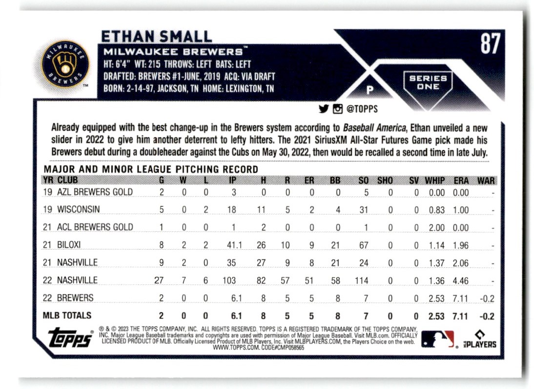 2023 Topps Ethan Small Rookie Milwaukee Brewers #87