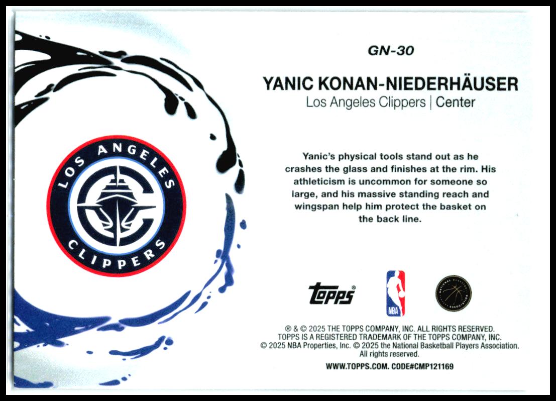 This is a nice example of a 2025-26 Topps #GN-30 Yanic Konan-Niederhäuser Generation Now.Other important information about this card: In 2025 Yanic Konan-Niederhäuser played for the Clippers. ***ANY STREAKS IN THE IMAGES ARE FROM THE SCANNER AND NOT THE CARD***📌 Card Description & ConditionWe take pride in providing an accurate and transparent representation of each card.RAW (Ungraded) Cards: Grading is subjective. While we strive to assess condition accurately, final judgment is up to the buyer.High-Resolution Scans (500+ DPI): Inspect every detail with confidence.No Stock Photos: The card pictured is the exact one you’ll receive.Graded Cards: Listed with their PSA/BGS/SGC rating and certification number for verification.📢 Please review all images carefully before purchasing. Have questions? Feel free to ask!Shipping for auctions is whatever is listed in the auction. Some will be $4.99 while others may be free. Many auctions will ship in plain white envelopes, bubble mailer