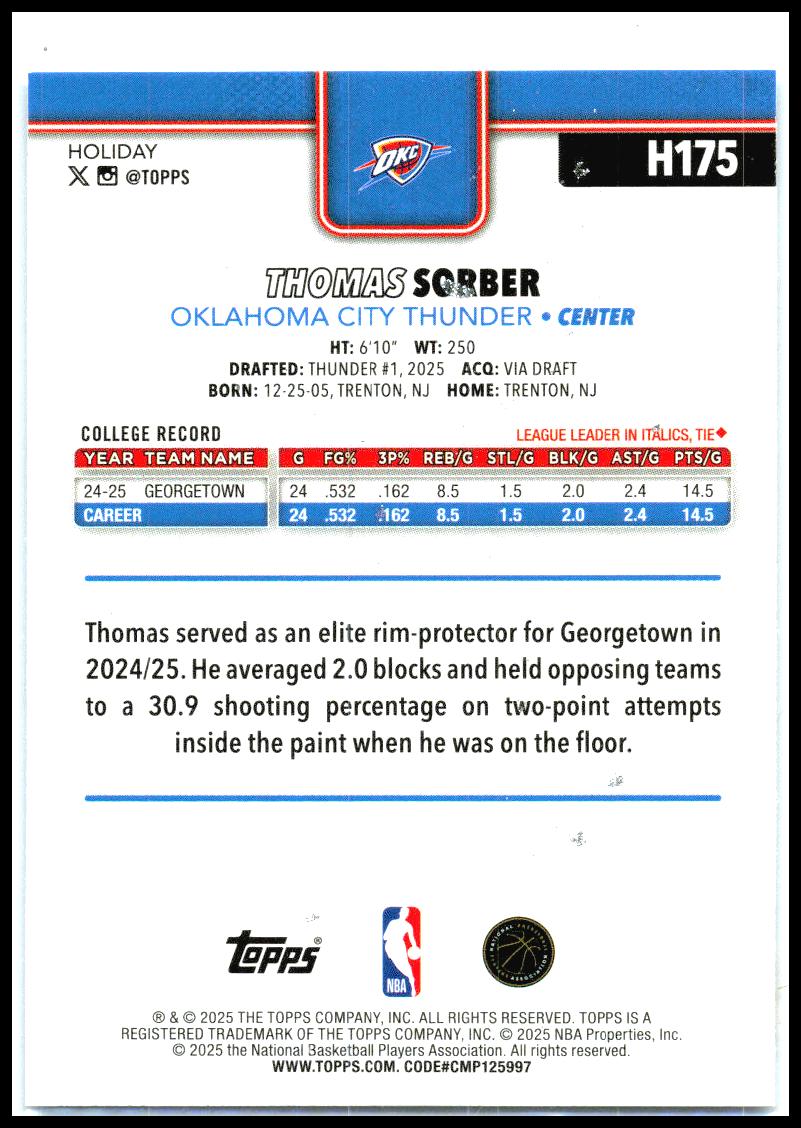This is a nice example of a 2025-26 Topps Holiday #H175 Thomas Sorber Light Blue Holiday.Other important information about this card: RC In 2025 Thomas Sorber played for the Thunder. ***ANY STREAKS IN THE IMAGES ARE FROM THE SCANNER AND NOT THE CARD***๐ Card Description & ConditionWe take pride in providing an accurate and transparent representation of each card.RAW (Ungraded) Cards: Grading is subjective. While we strive to assess condition accurately, final judgment is up to the buyer.High-Resolution Scans (500+ DPI): Inspect every detail with confidence.No Stock Photos: The card pictured is the exact one youโll receive.Graded Cards: Listed with their PSA/BGS/SGC rating and certification number for verification.๐ข Please review all images carefully before purchasing. Have questions? Feel free to ask!Shipping for auctions is whatever is listed in the auction.ย Some will be $4.99 while others may be free. Many auctions will ship in plain white envelopes, bubble mailers, or rig