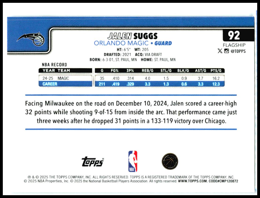 This is a nice example of a 2025-26 Topps #92 Jalen Suggs Sandgliter.Other important information about this card: In 2025 Jalen Suggs played for the Magic. ***ANY STREAKS IN THE IMAGES ARE FROM THE SCANNER AND NOT THE CARD***๐ Card Description & ConditionWe take pride in providing an accurate and transparent representation of each card.RAW (Ungraded) Cards: Grading is subjective. While we strive to assess condition accurately, final judgment is up to the buyer.High-Resolution Scans (500+ DPI): Inspect every detail with confidence.No Stock Photos: The card pictured is the exact one youโll receive.Graded Cards: Listed with their PSA/BGS/SGC rating and certification number for verification.๐ข Please review all images carefully before purchasing. Have questions? Feel free to ask!Shipping for auctions is whatever is listed in the auction.ย Some will be $4.99 while others may be free. Many auctions will ship in plain white envelopes, bubble mailers, or rigid cardboard to utilize eBa