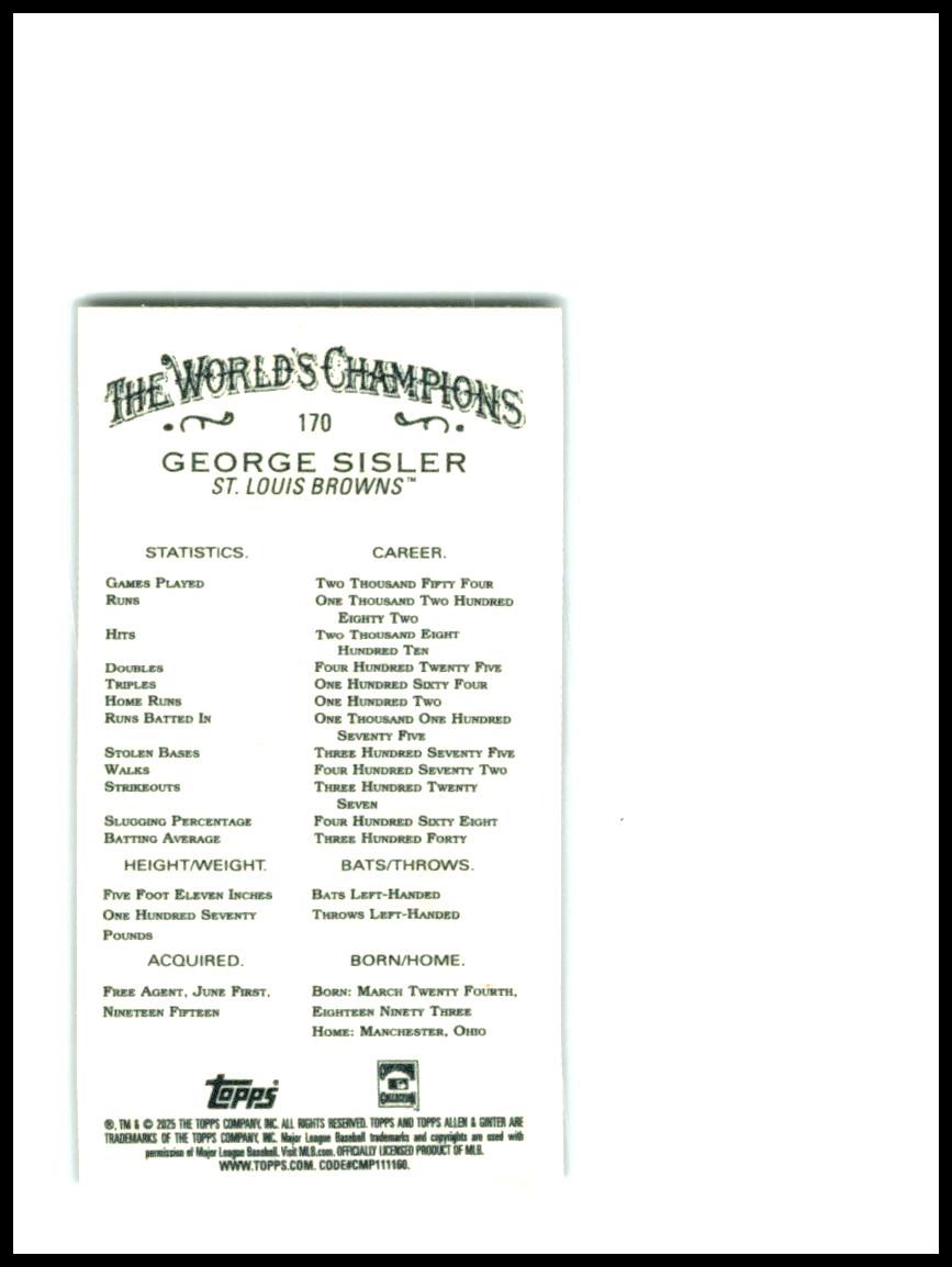 This is a nice example of a 2025 Topps Allen & Ginter #170 George Sisler Mini Black.Other important information about this card: In 2025 George Sisler played for the New England Patriots. ***ANY STREAKS IN THE IMAGES ARE FROM THE SCANNER AND NOT THE CARD***๐ Card Description & ConditionWe take pride in providing an accurate and transparent representation of each card.RAW (Ungraded) Cards: Grading is subjective. While we strive to assess condition accurately, final judgment is up to the buyer.High-Resolution Scans (500+ DPI): Inspect every detail with confidence.No Stock Photos: The card pictured is the exact one youโll receive.Graded Cards: Listed with their PSA/BGS/SGC rating and certification number for verification.๐ข Please review all images carefully before purchasing. Have questions? Feel free to ask!Shipping for auctions is whatever is listed in the auction.ย Some will be $4.99 while others may be free. Many auctions will ship in plain white envelopes, bubble mailers, o