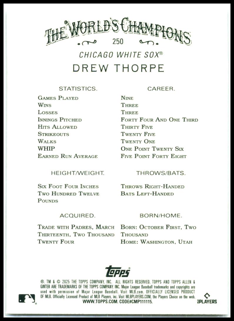 This is a nice example of a 2025 Topps Allen & Ginter #250 Drew Thorpe Silver Portrait.Other important information about this card: RC In 2025 Drew Thorpe played for the White Sox. ***ANY STREAKS IN THE IMAGES ARE FROM THE SCANNER AND NOT THE CARD***๐ Card Description & ConditionWe take pride in providing an accurate and transparent representation of each card.RAW (Ungraded) Cards: Grading is subjective. While we strive to assess condition accurately, final judgment is up to the buyer.High-Resolution Scans (500+ DPI): Inspect every detail with confidence.No Stock Photos: The card pictured is the exact one youโll receive.Graded Cards: Listed with their PSA/BGS/SGC rating and certification number for verification.๐ข Please review all images carefully before purchasing. Have questions? Feel free to ask!Shipping for auctions is whatever is listed in the auction.ย Some will be $4.99 while others may be free. Many auctions will ship in plain white envelopes, bubble mailers, or rigid